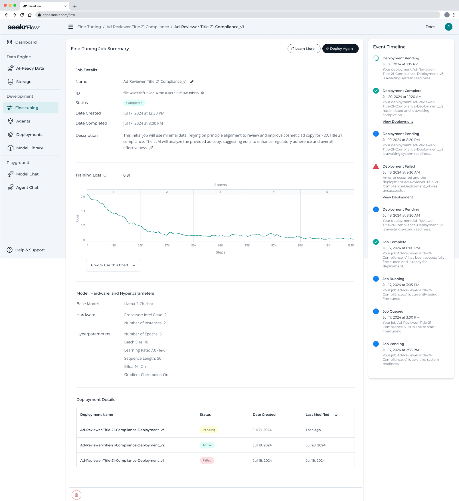 Figure 11. Fine‑Tuning Job Summary showing training metrics, data lineage, hyperparameters, and deployment history.