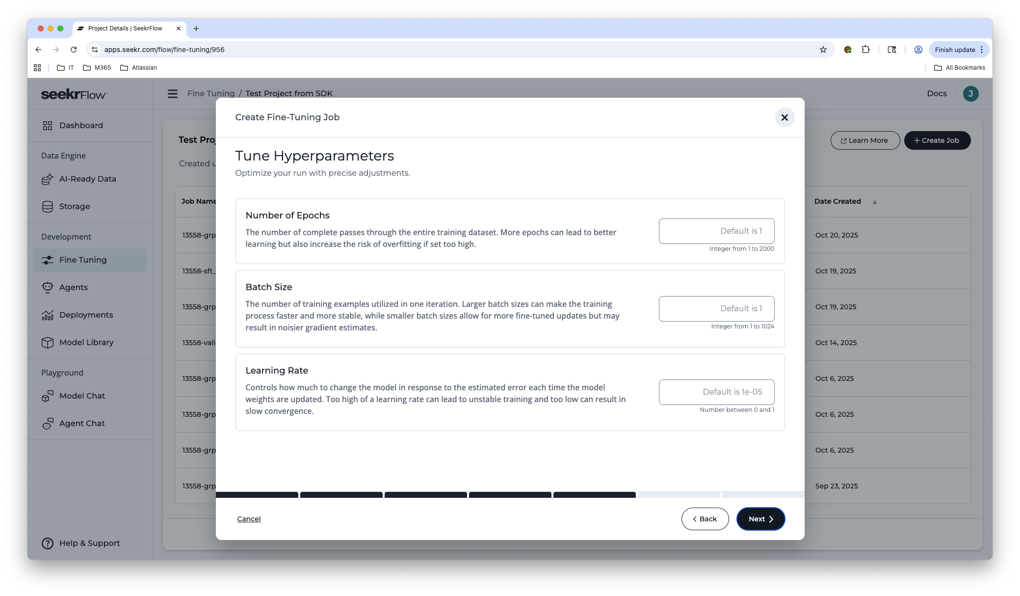 This guide explains how to explore, create, and manage fine‑tuning projects and jobs in SeekrFlow using the web interface. It complements the SDK workflow by showing the point‑and‑click equivalent